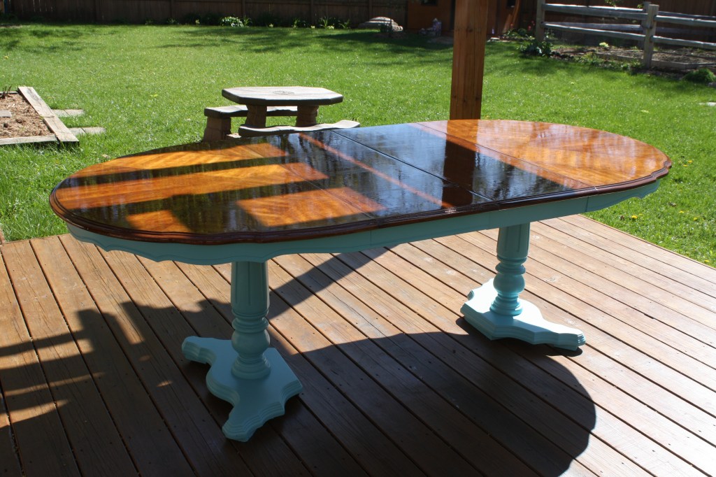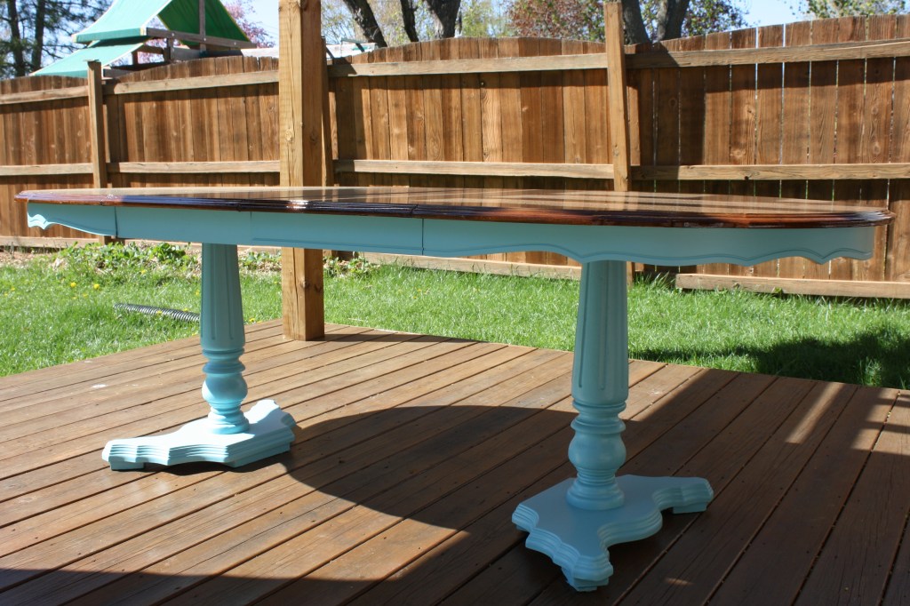 I then went to every thrift store and antique mall in the city (and my husband will attest that there are MANY in our area), and finally came upon a fabulous dining room table that had two additional leaves that could be added. With a little tender loving care I knew it would be the perfect table for our many outdoor summer gatherings with family and friends. I repainted the bottom portion of the table, my husband fastened the leaves together so that it would stay together permanently, and I then put several layers of outdoor polyurethane on the table top to add some extra protection.