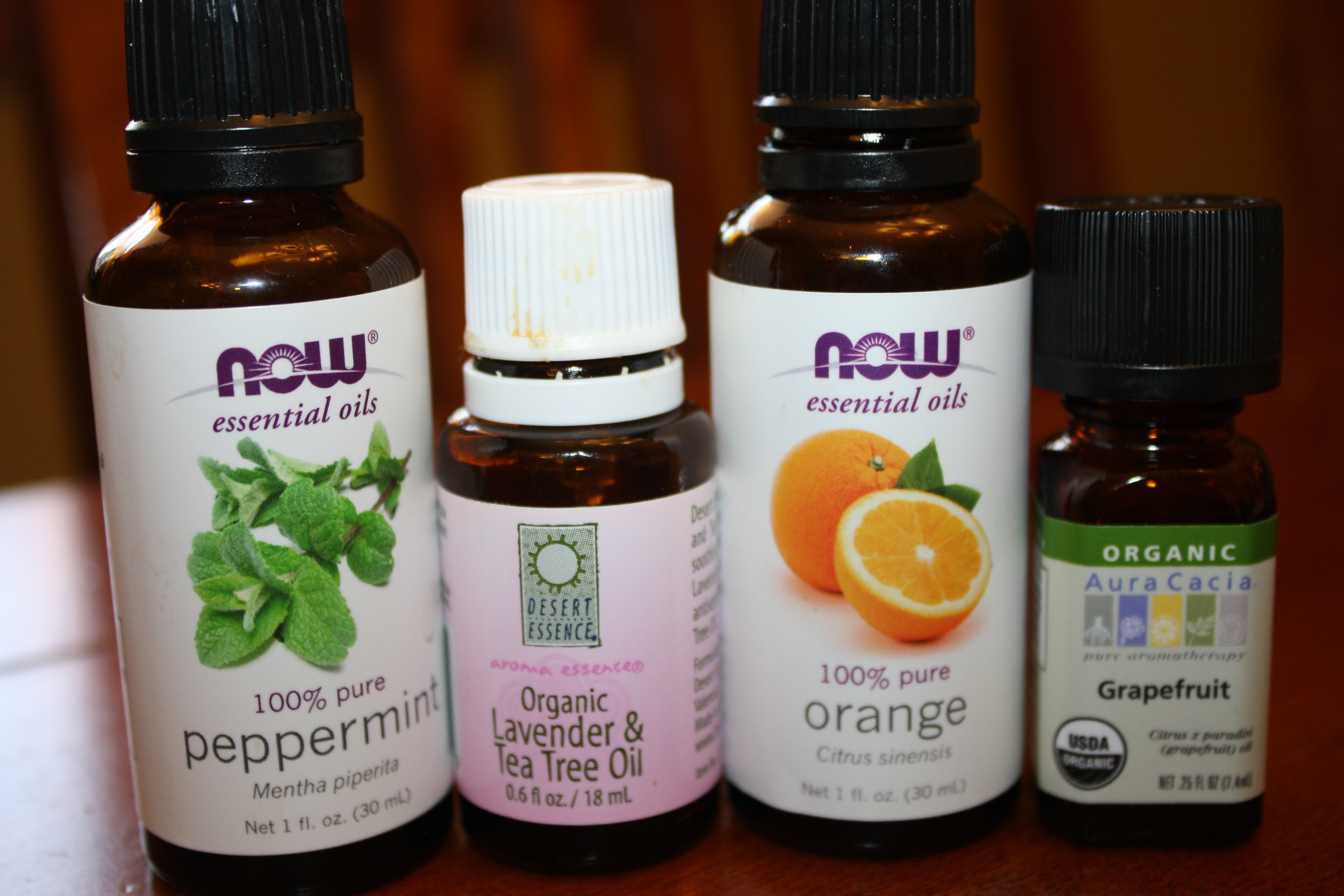 In a plastic spray bottle, fill it with half water and half white vinegar (known for its strong antibacterial properties).  Then add 20 drops of grapefruit essential oil (known for its anti-viral and anti-microbial properties).  I also like to add about 10 drops of orange essential oil to add a bit more of a citrus kick to the cleaner.  Shake the bottle before each use.  Spray on surfaces and wipe with a clean cloth.