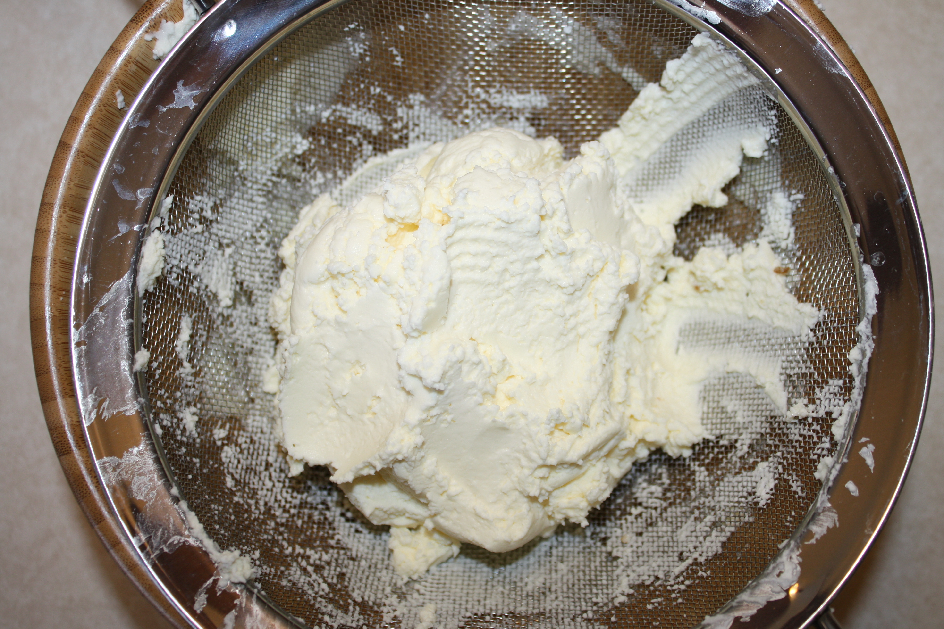 Once there is a clear separation between the butter solids and watery substance, place the butter in a fine mesh strainer or in butter muslin until all of the moisture has been drained.