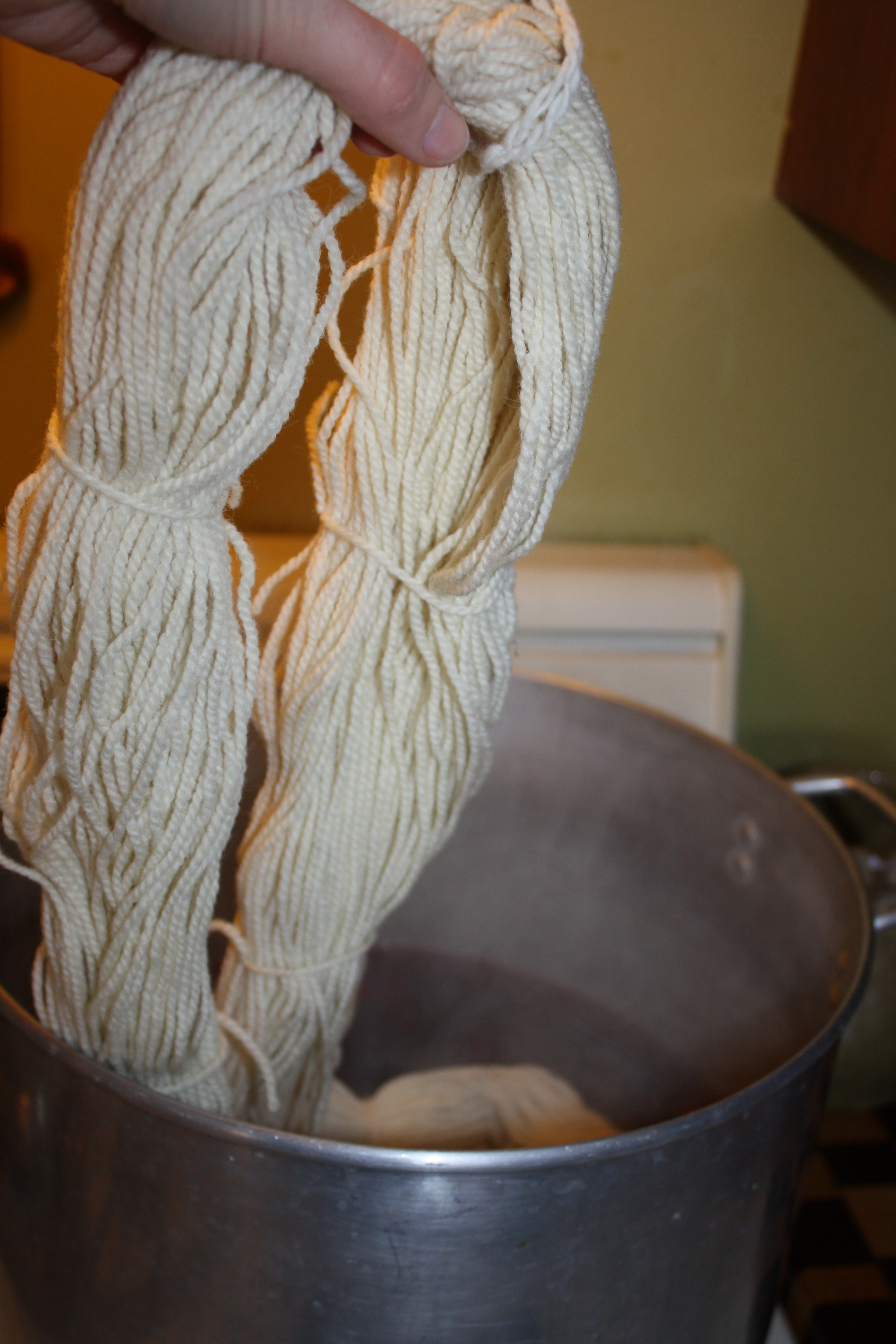 Bring the ingredients to a boil.  Let it slow boil for about 20 minutes.  Reduce the heat to a simmer and add the yarn.  (I tied off the skein a bit more too.  I didn’t want it to get tangled while it “cooked.”)