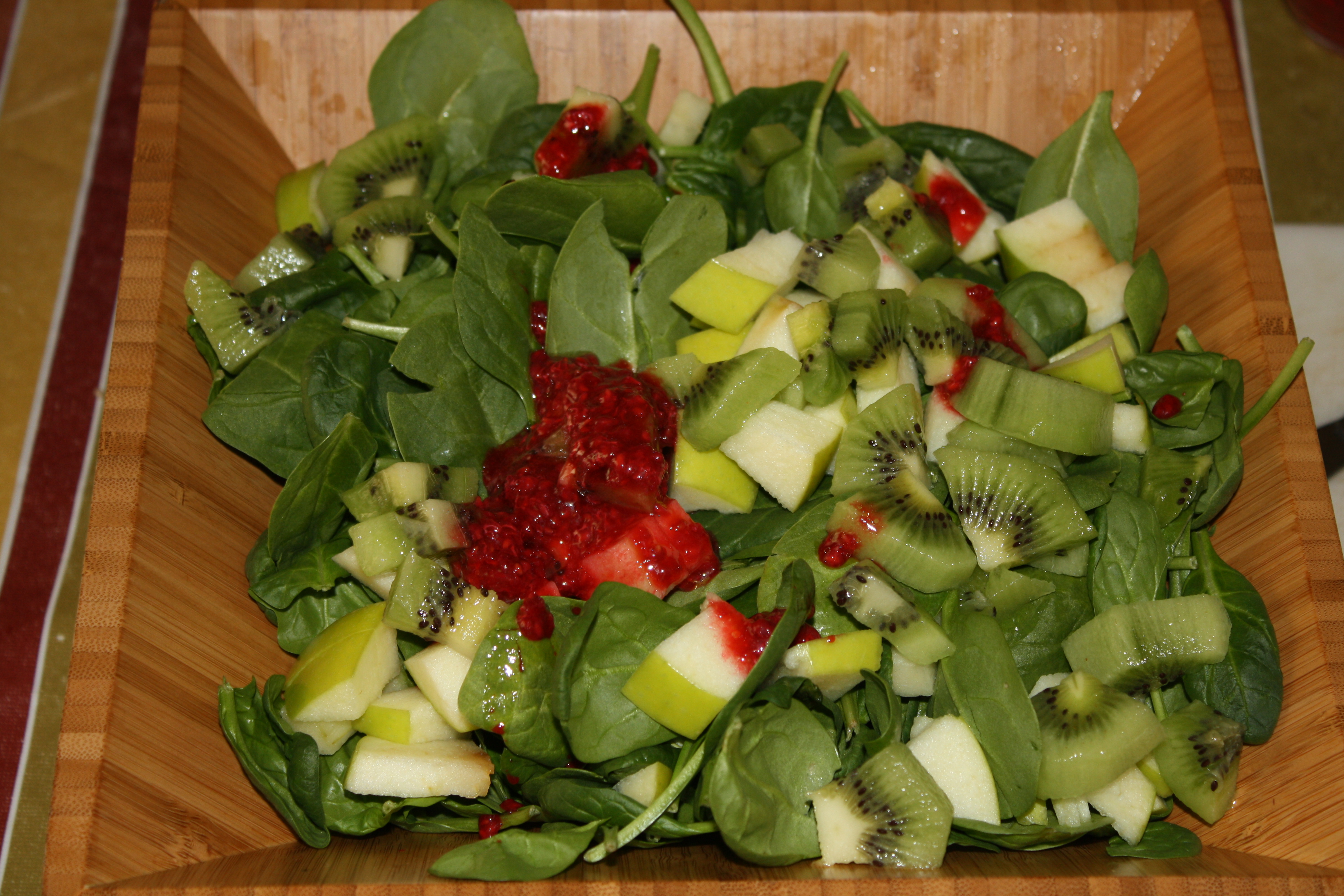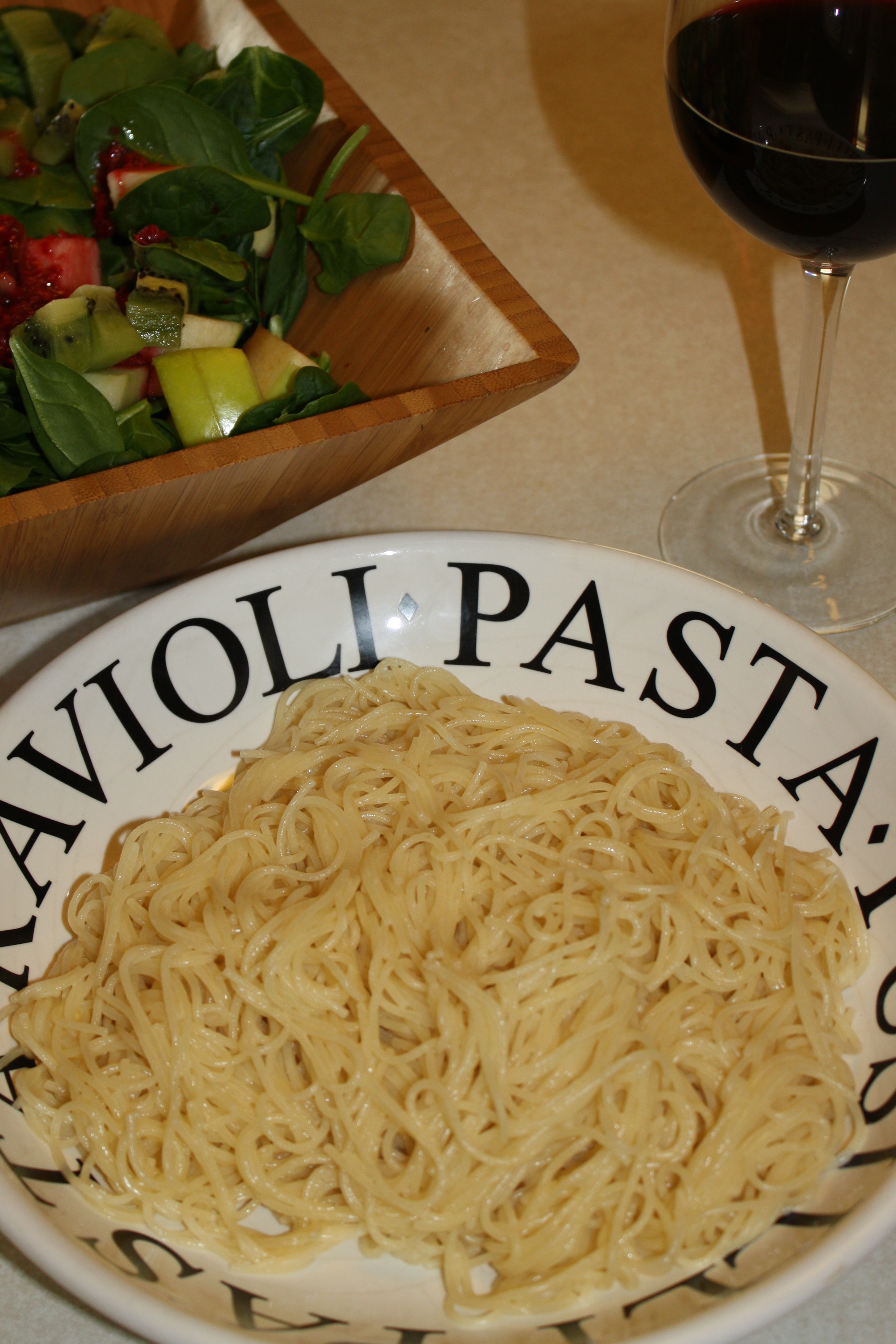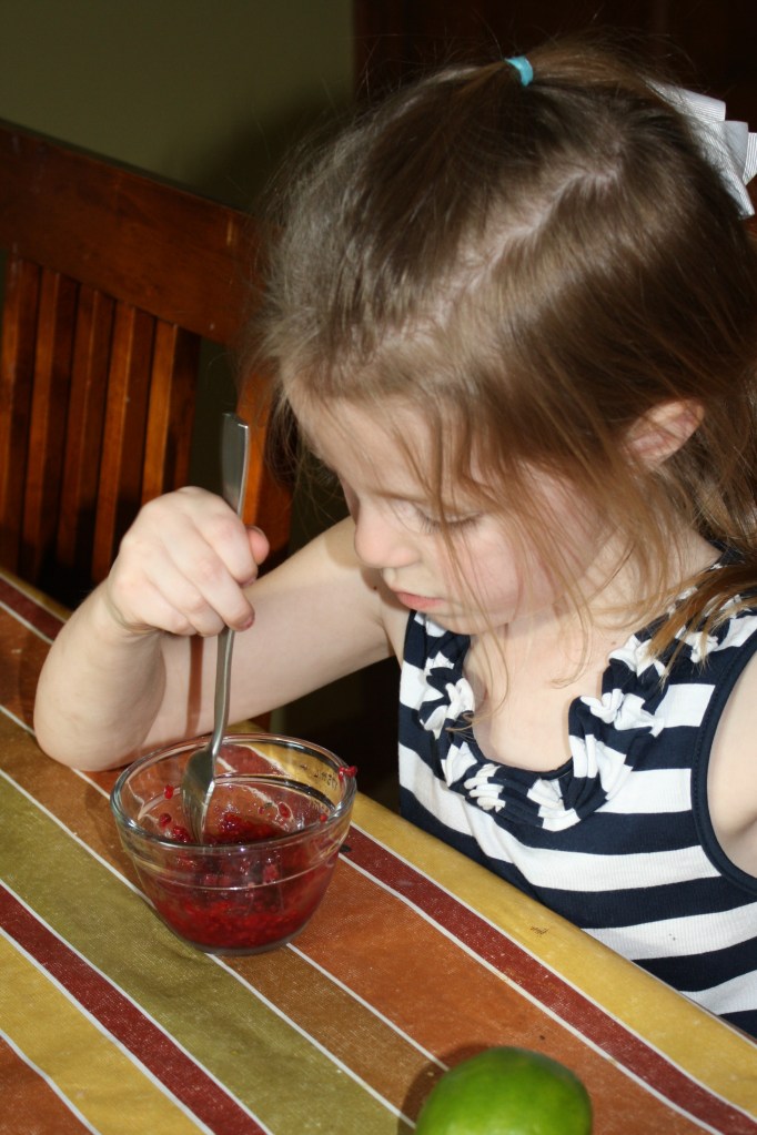 And on my five-year old chef’s menu was a spinach salad with apples and kiwi and a homemade raspberry lime dressing.  (She created the recipe for this dressing completely on her own.  In the store she told me she needed to buy limes to use as the acid with the olive oil in her dressing.  A smart cookie this one is!)  And the main course was her all time favorite:  angel hair pasta with pasture butter sauce.