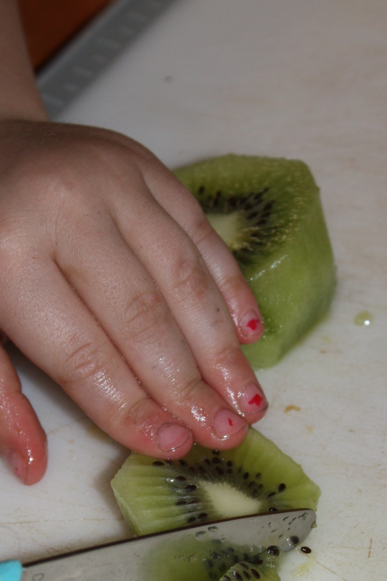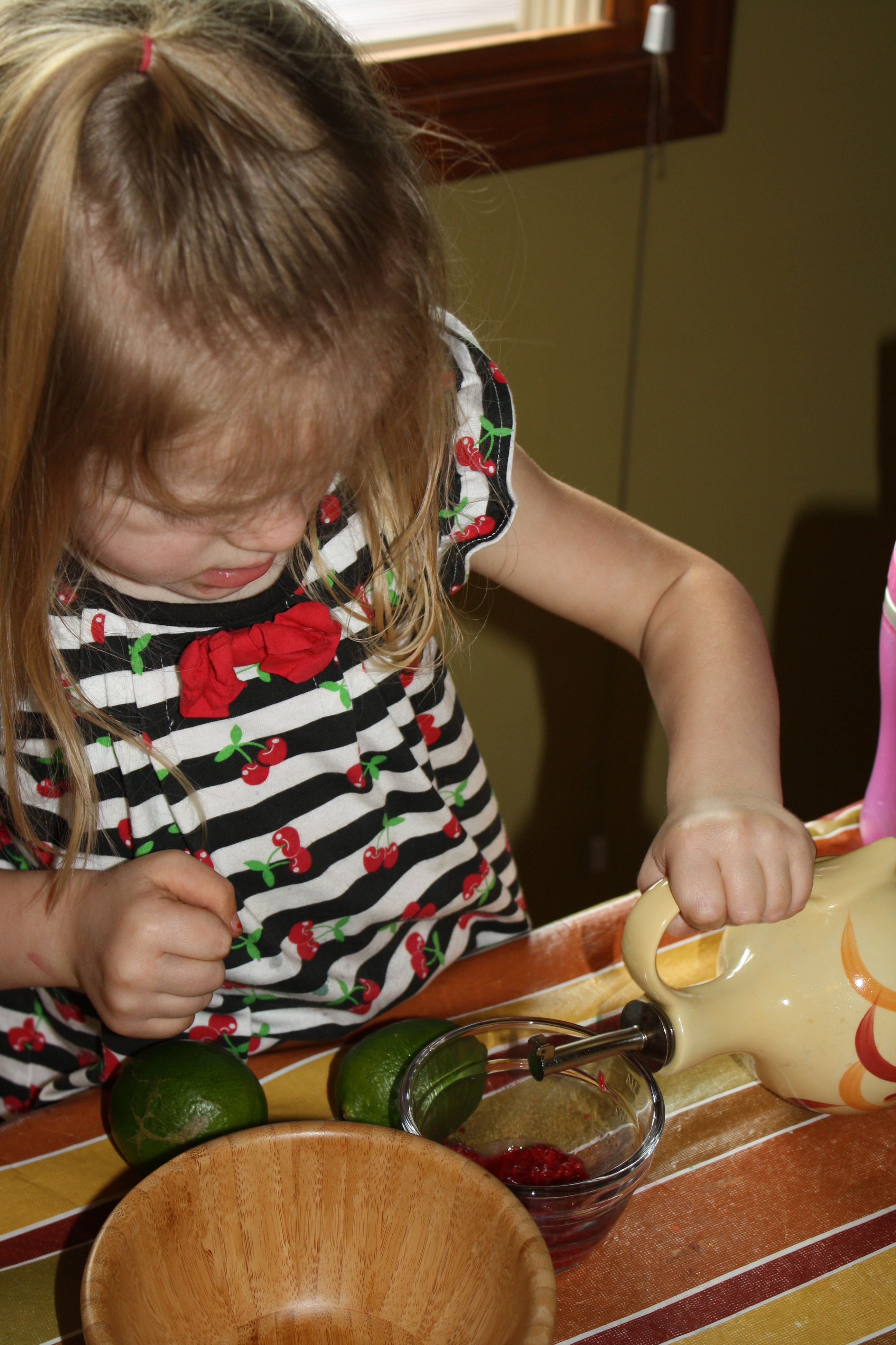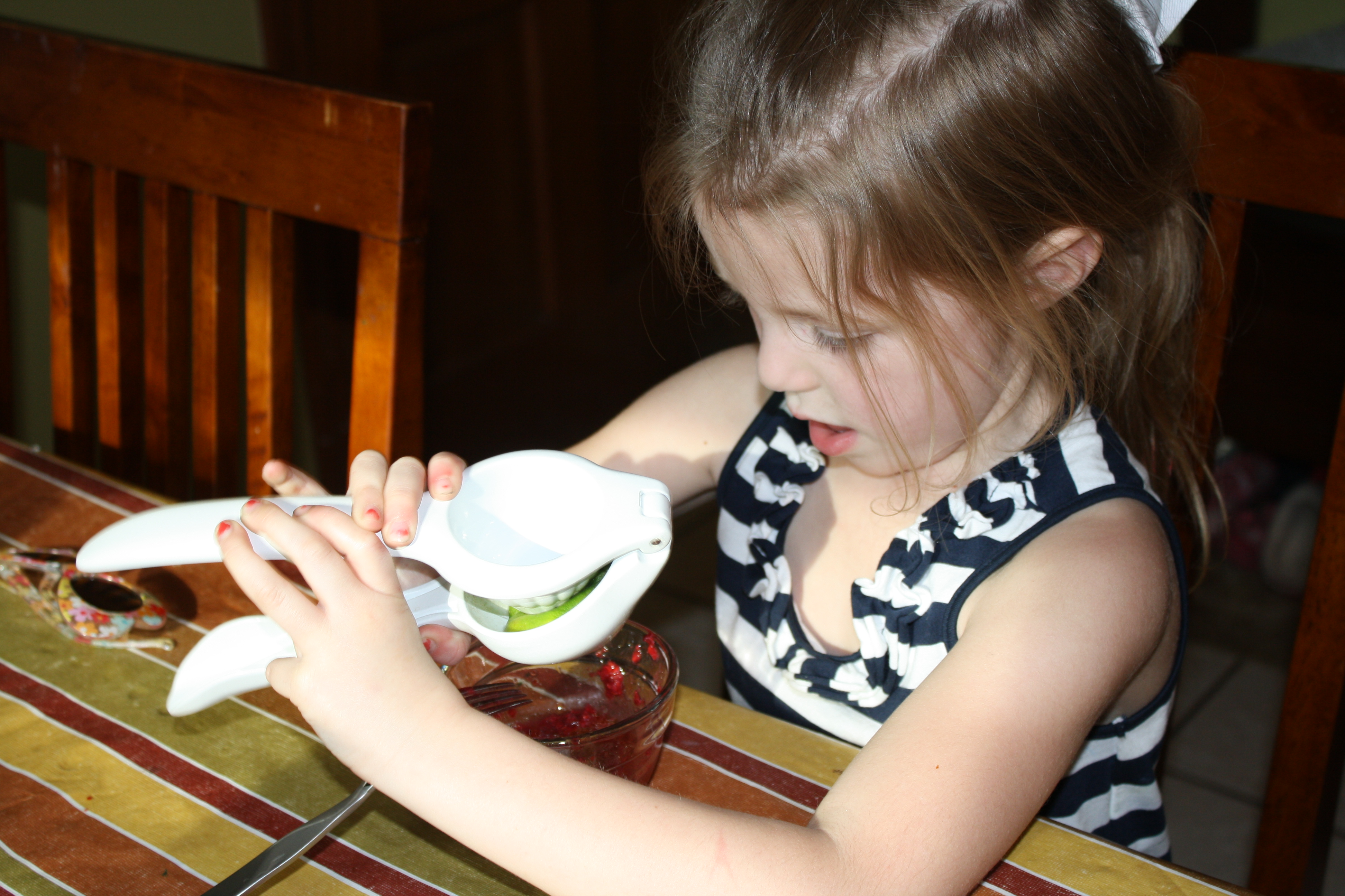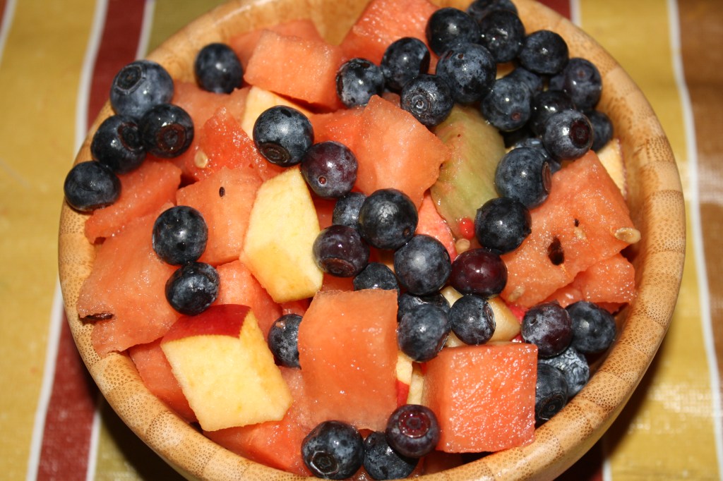 On my two-year old chef’s menu was a fruit salad with watermelon, kiwi, apples and blueberries with a homemade raspberry lime dressing (recipe courtesy of her big sis).