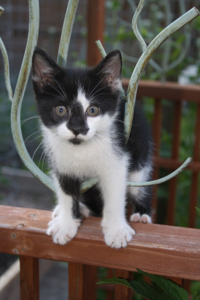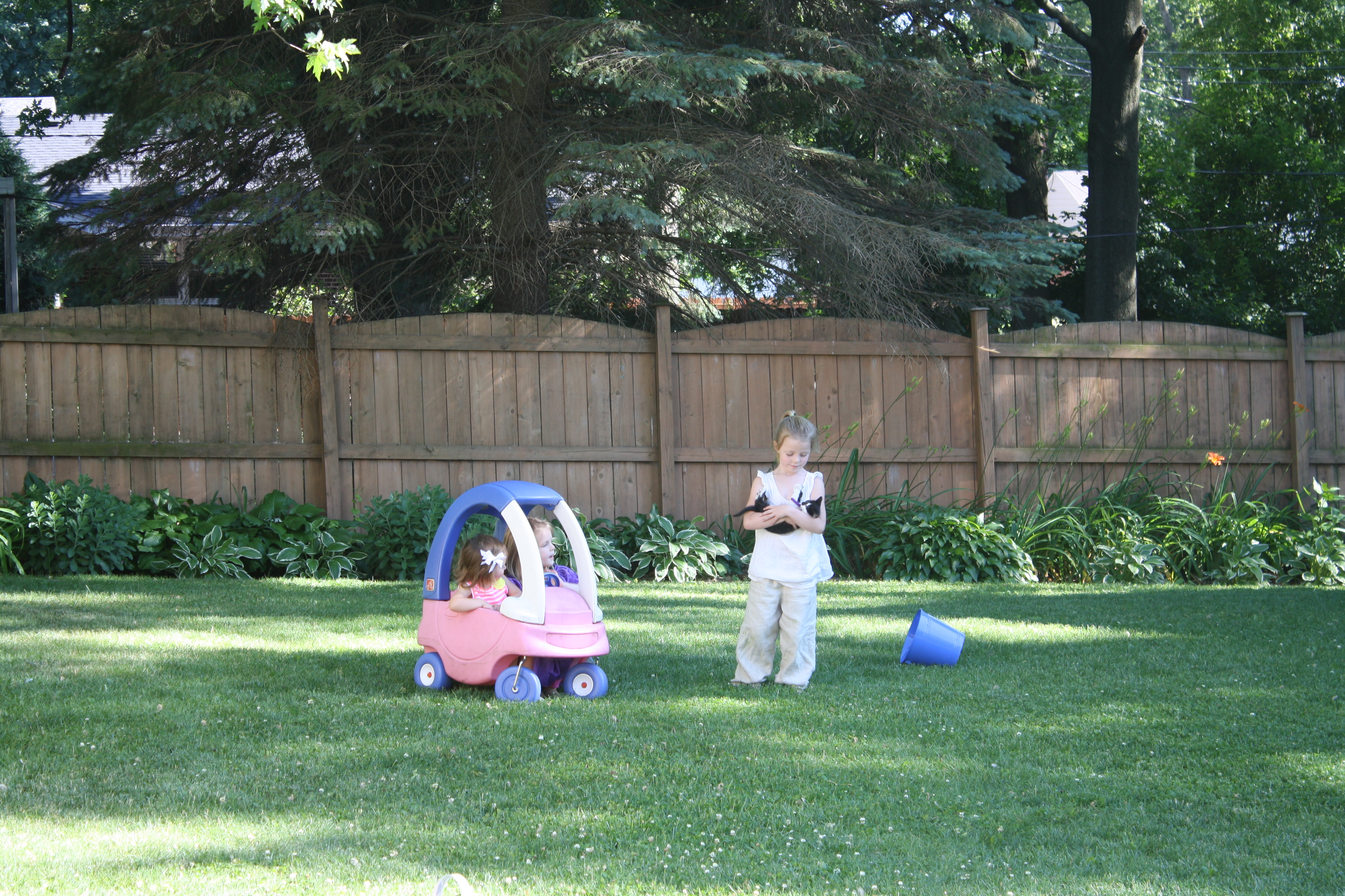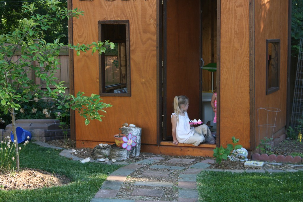 ~a freshly mulched garden. (And yes, that is a glass of wine on the fencepost. One needs some mode of relief from the back pain of hauling said mulch, right?)