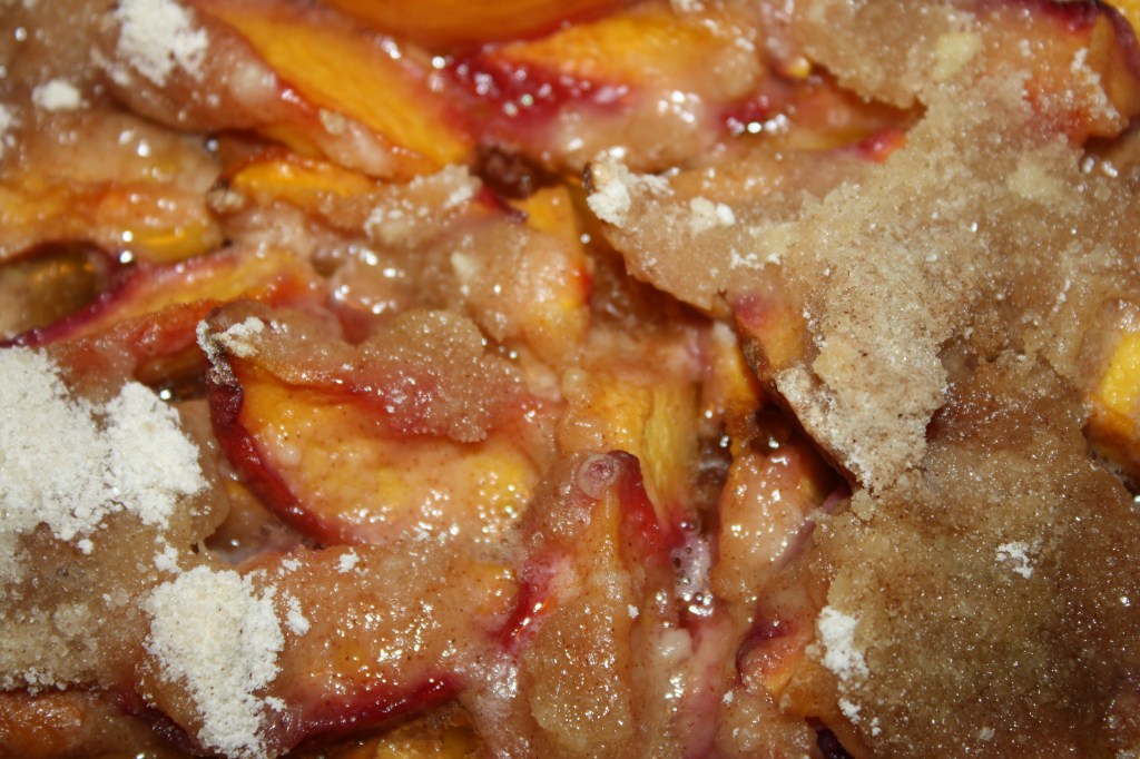 I add about 10 tiny dollops of butter on top of the peaches, and then create a mixture of 1 cup sugar, 4 tablespoons flour and 1 teaspoon cinnamon. I scoop this mixture over the peaches and butter so the entire pie is coated. I then add just a touch (about 1/4 cup) of water to the pie. This creates a delicious custard-like consistency. Bake at 400 degrees for 15 minutes and then reduce the heat to 325 degrees for 45 minutes.