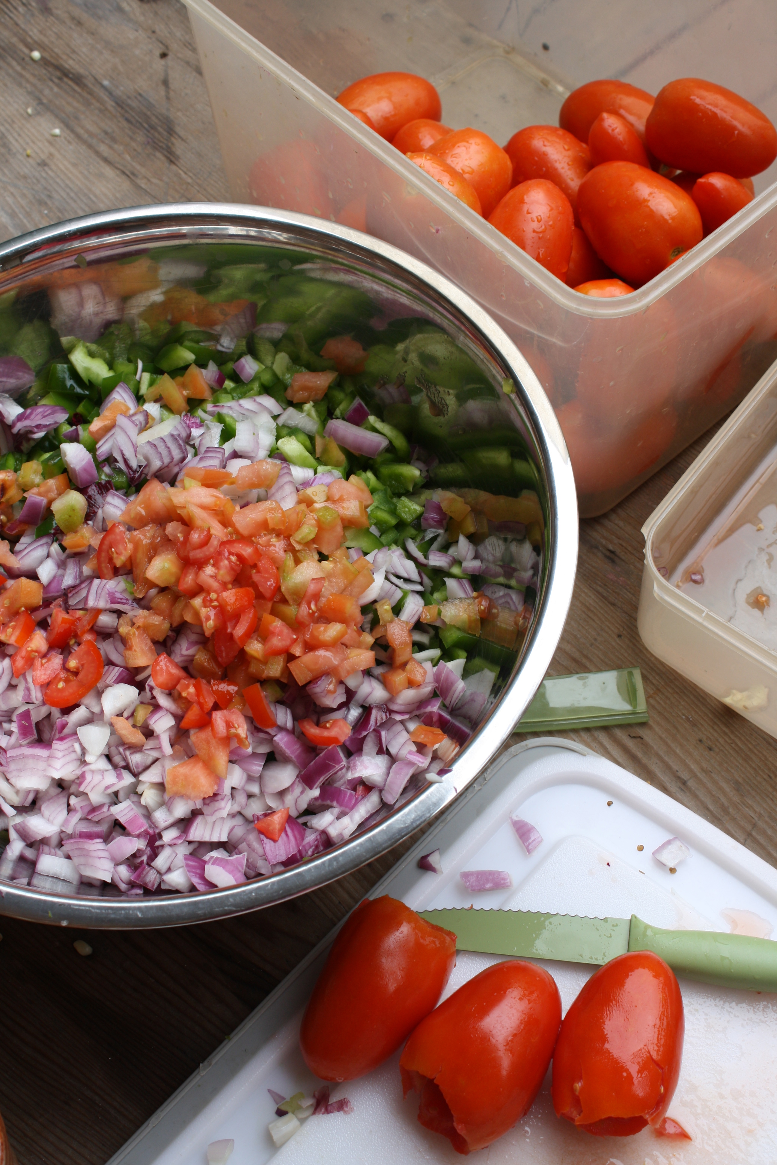 This is the first year that we have not planted any slicing tomatoes.  We planted only small cherry-type tomatoes (Juliets and Mexican Midgets) for the girls to snack on, and paste tomatoes (Viva Italias, Speckled Romans and Amish Pastes) to use for tomato sauces and salsas.  What I didn’t realize about these types of plants is how many more fruits they produce compared to slicing tomatoes.  Oh my.  On Monday afternoon while I was picking, I found 4-6 ripe tomatoes, 6-8 I’m-almost-ready tomatoes, and about 20 addition green tomatoes just waiting to get ripe.  That is also not factoring in that each plant still has about 20-30 blossoms.  Apparently the tomatoes have done just fine with all of this heat.