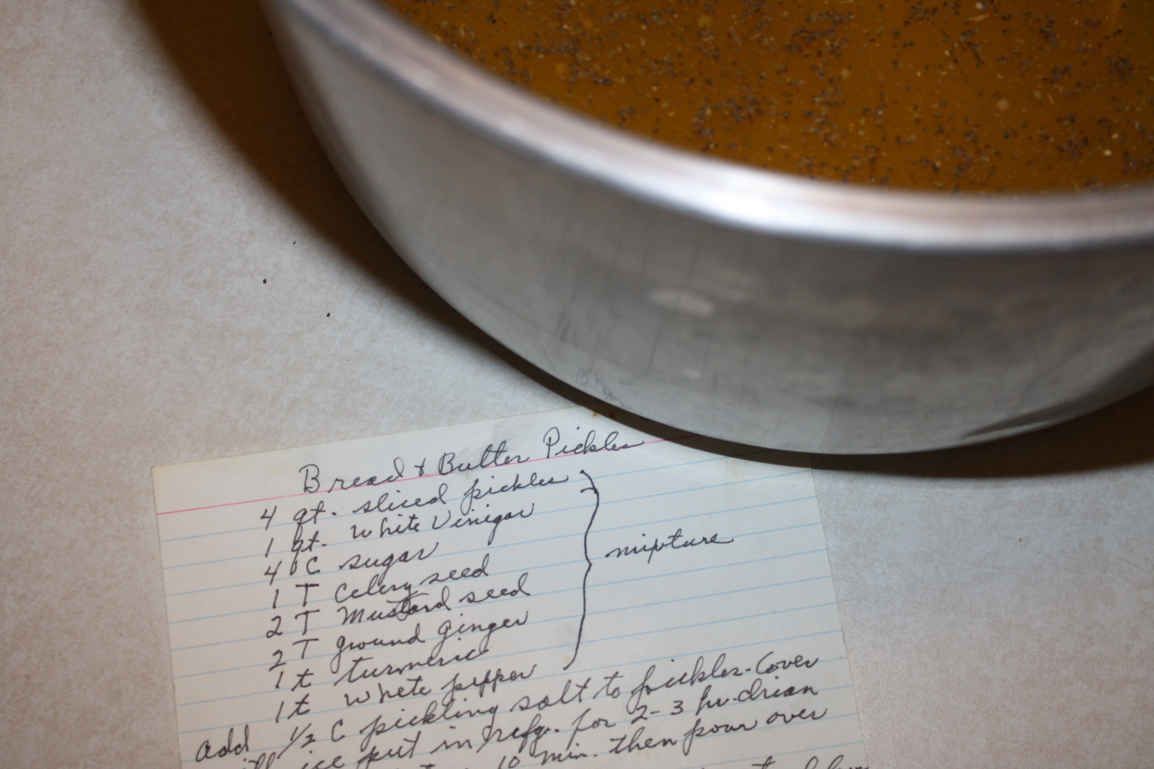 {I struck gold this week!  I found my grandfather’s recipe box in the back of my parents’ pantry.  It contains all of his old canning recipes, including his bread and butter pickles, my favorite of all his canning greats.}