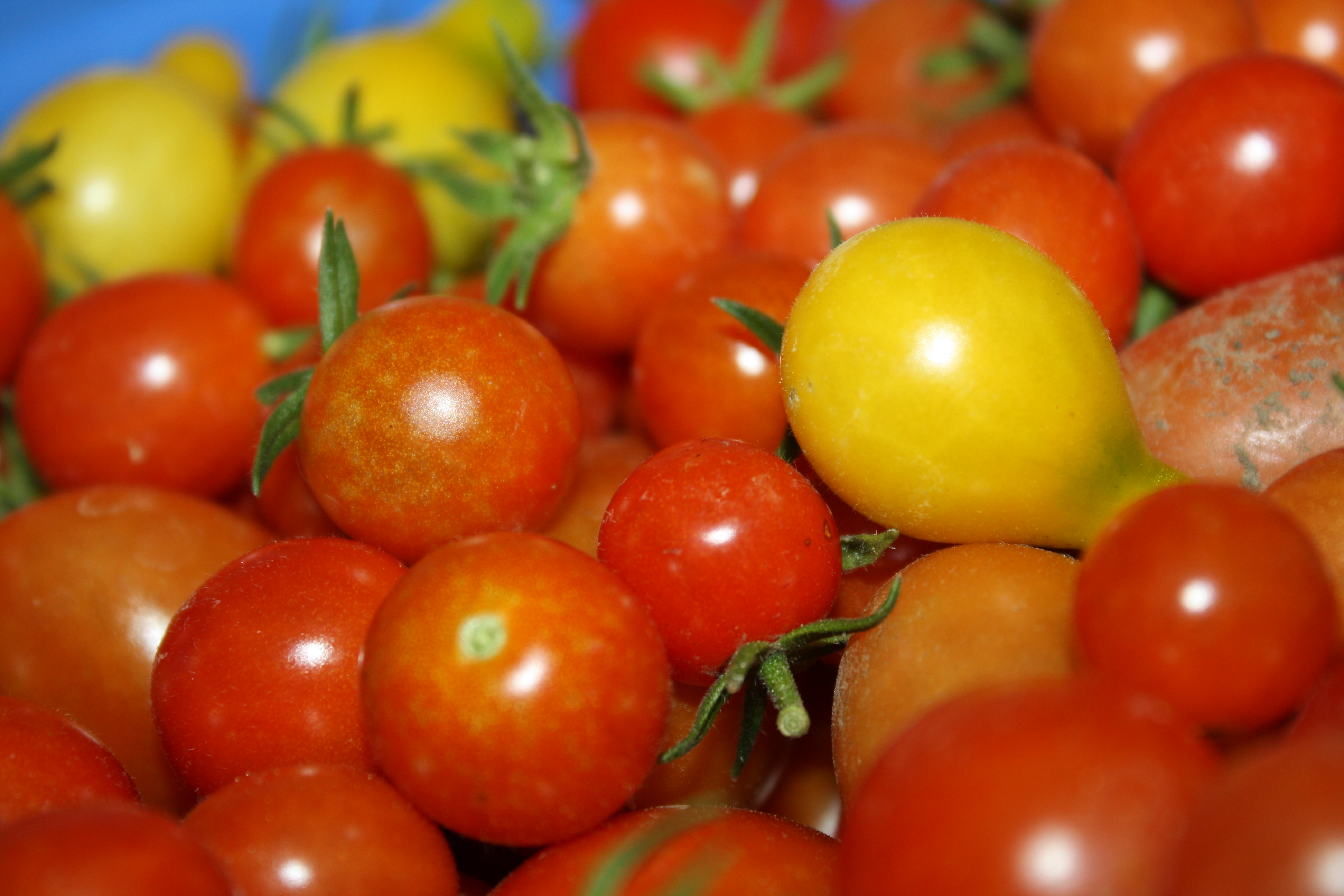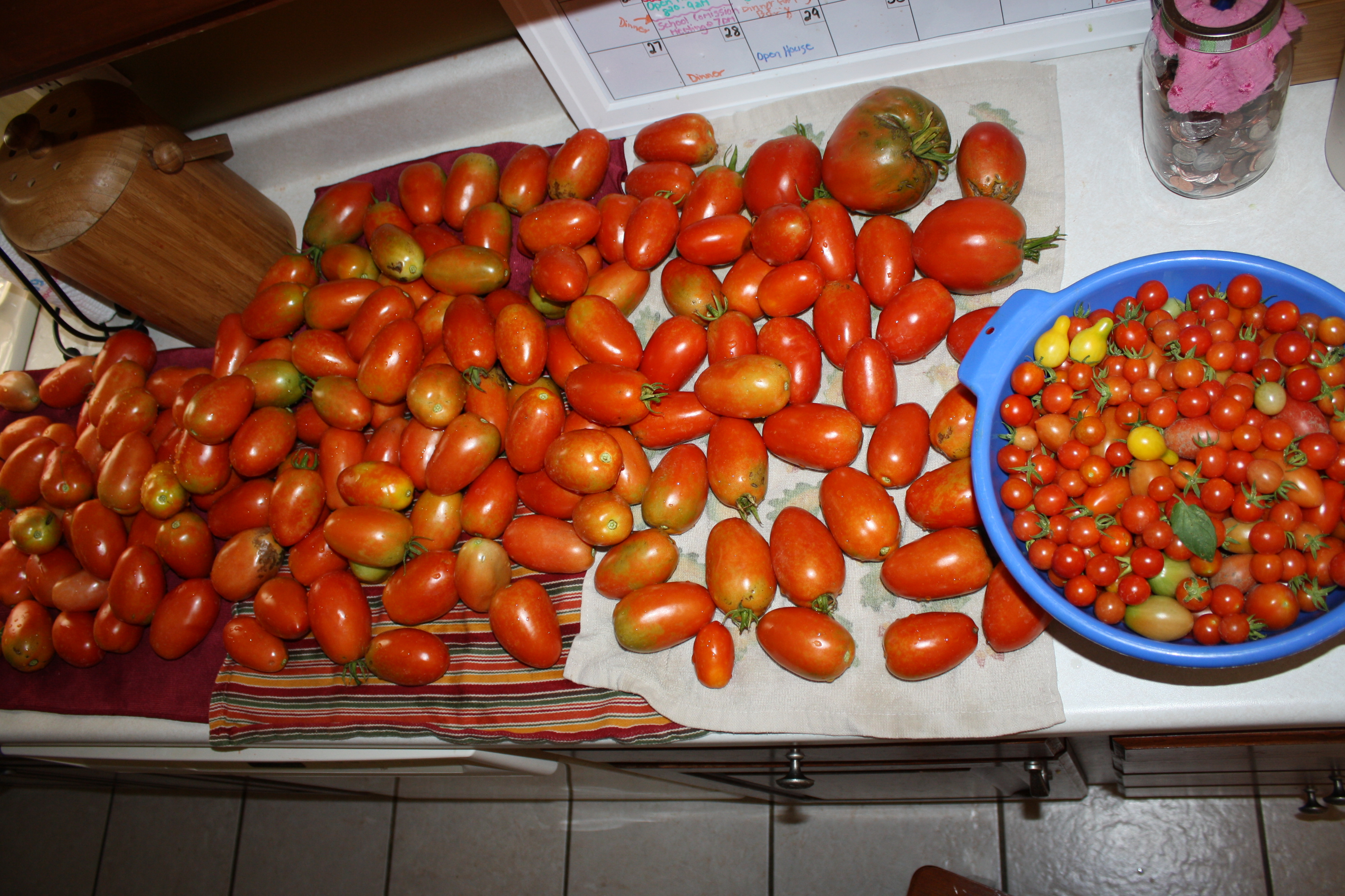 This is the first year that we have not planted any slicing tomatoes. We planted only small cherry-type tomatoes (Juliets and Mexican Midgets) for the girls to snack on, and paste tomatoes (Viva Italias, Speckled Romans and Amish Pastes) to use for tomato sauces and salsas. What I didn’t realize about these types of plants is how many more fruits they produce compared to slicing tomatoes. Oh my. On Monday afternoon while I was picking, I found 4-6 ripe tomatoes, 6-8 I’m-almost-ready tomatoes, and about 20 addition green tomatoes just waiting to get ripe. That is also not factoring in that each plant still has about 20-30 blossoms. Apparently the tomatoes have done just fine with all of this heat.