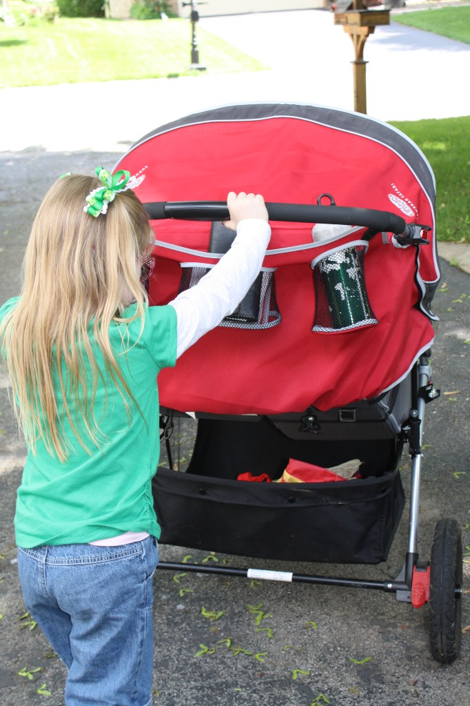 So with tiny wallet in hand, she headed out the door to begin our quest for lemons.  She even volunteered to push her sister in the stroller…She really wanted to make that lemonade I tell ya 🙂