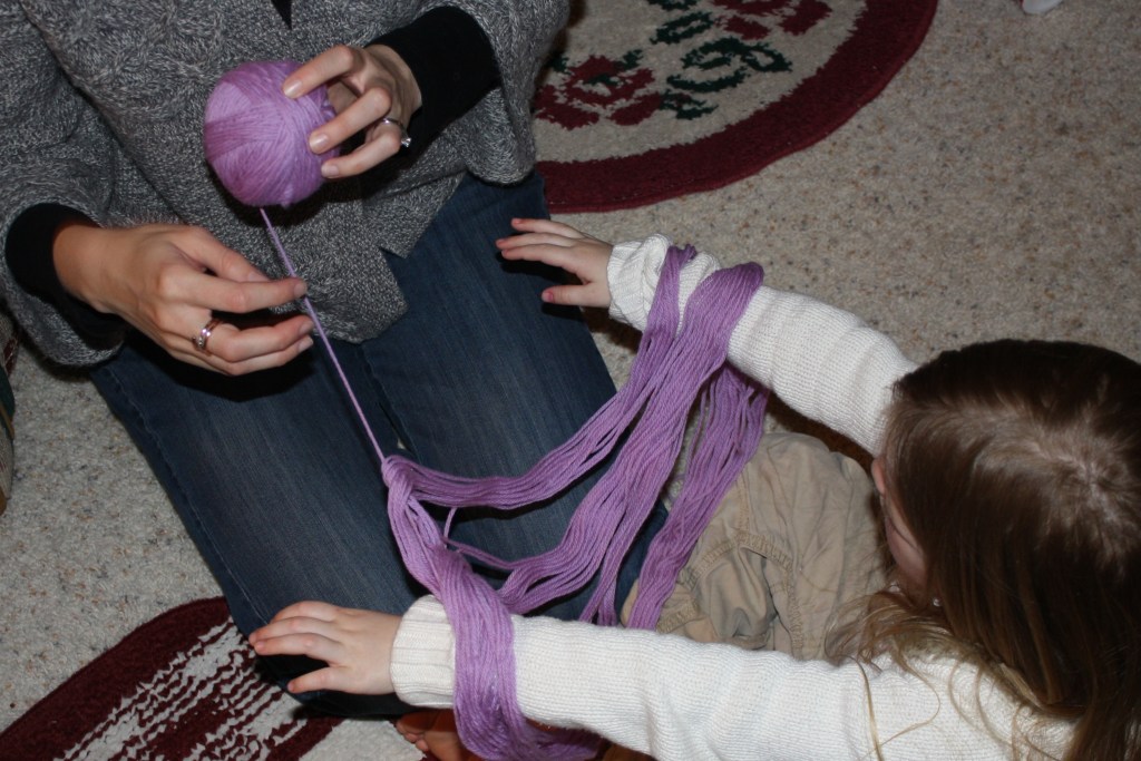 Here is my two-year old sporting the first finished product:  a little bitty shawl for those chilly mornings in the spring and summer when you just need a little something to snuggle up with.  I am sad to say that I have no idea how to read a pattern, so everything I make I create without a pattern.  But I did get my inspiration from this blog post.  The shawl is made with a beautiful lamb’s wool/bamboo blend, so you get the warmth of the wool without the scratchiness that sometimes accompanies woolen garments.